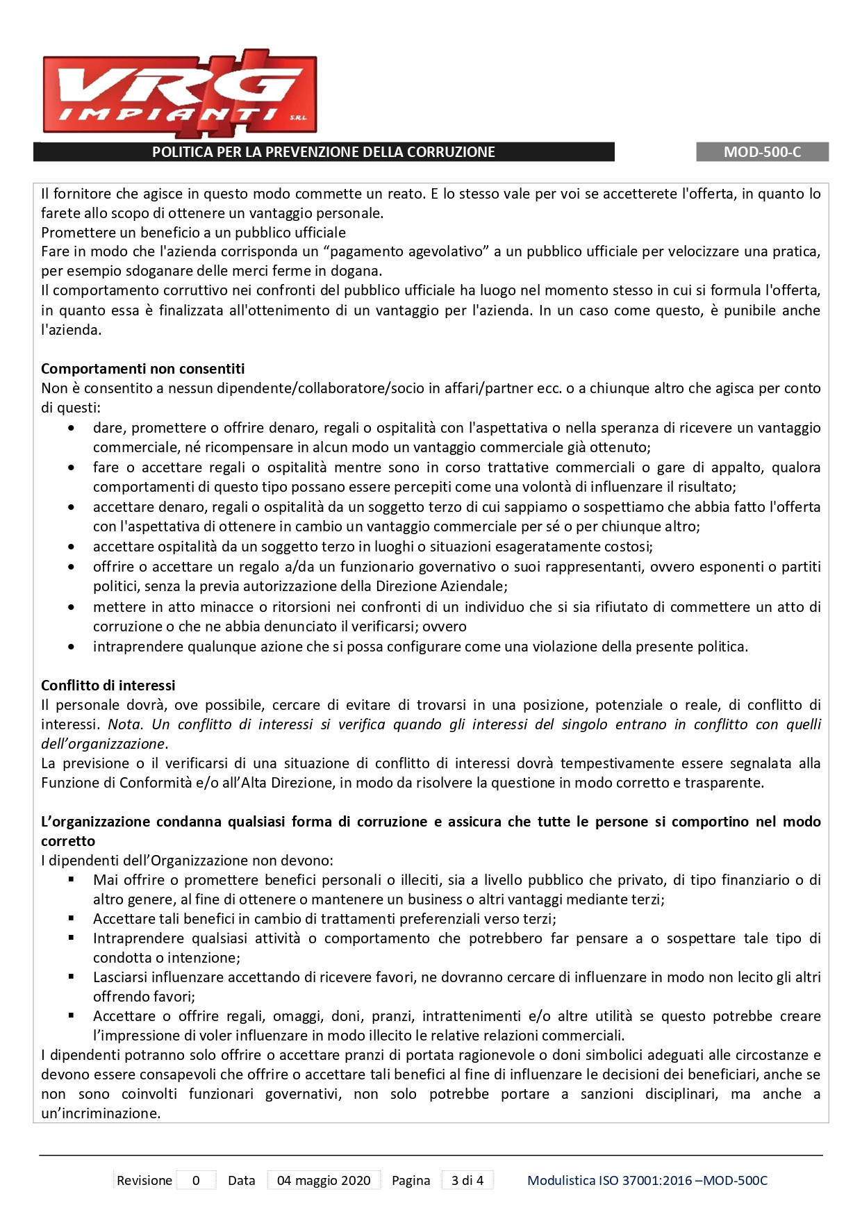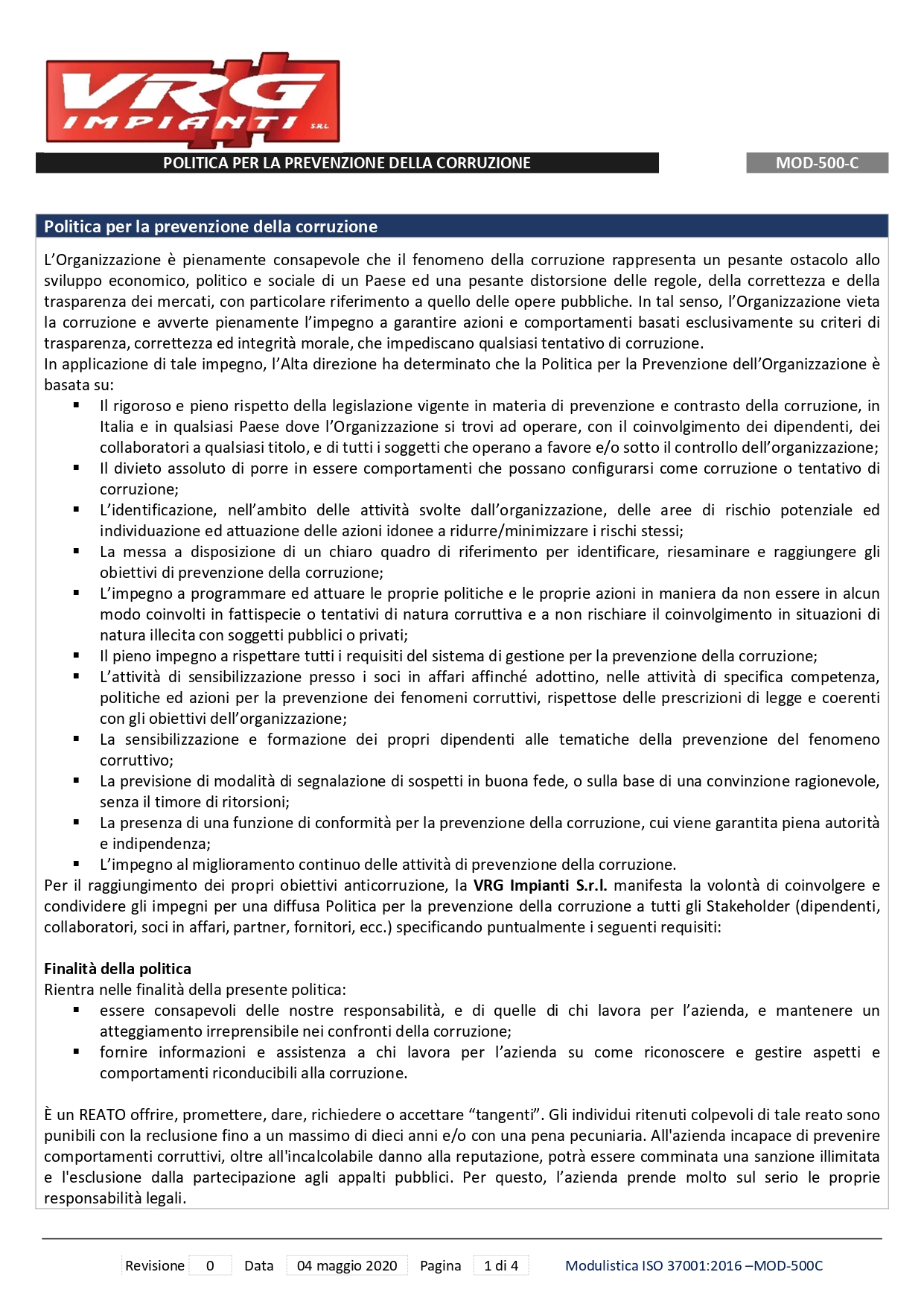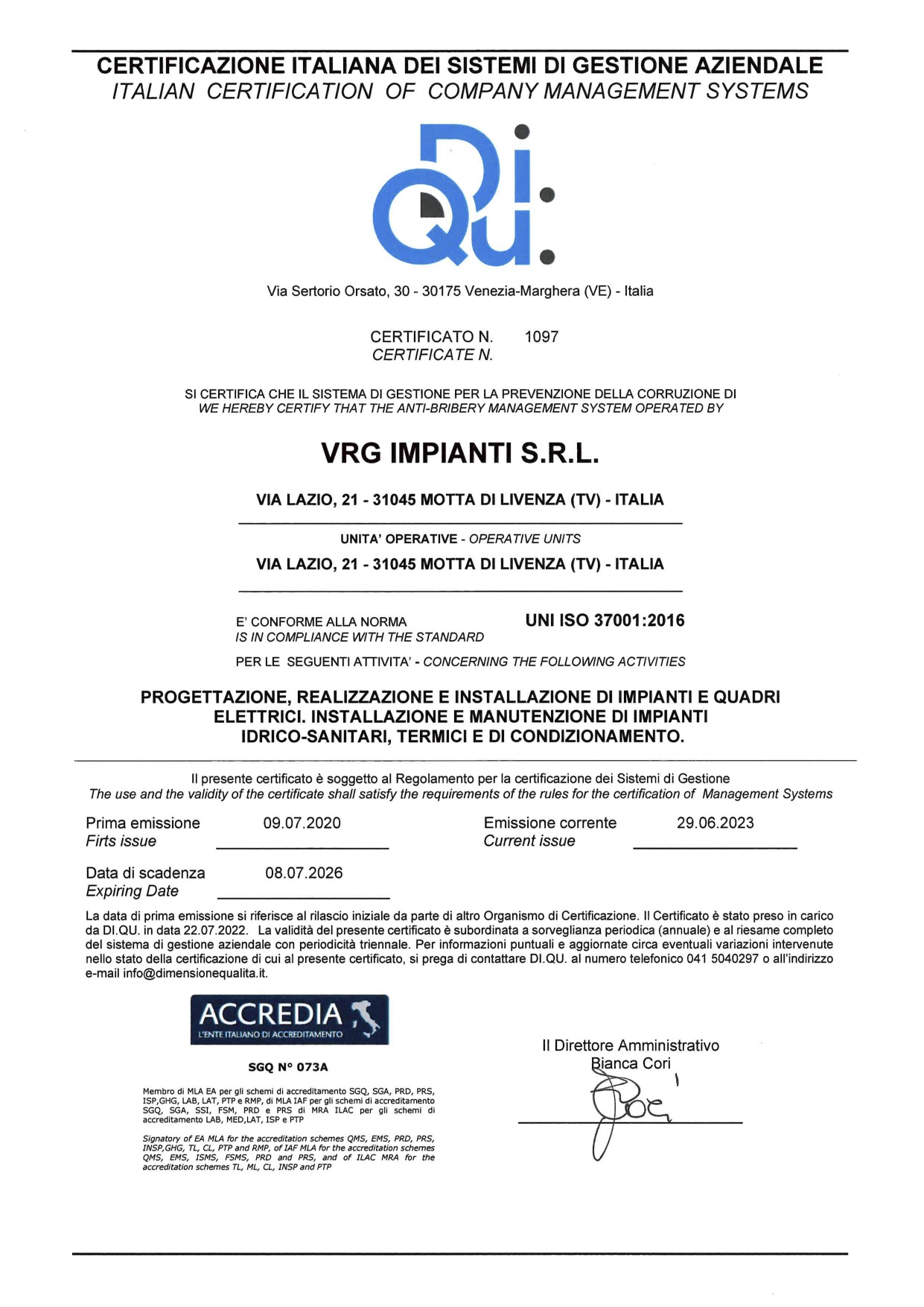 VRG Impianti Srl ha implementato un Sistema di Gestione per la prevenzione della corruzione secondo la norma UNI EN ISO 37001:2016, ottenendo nel 2020 la certificazione.