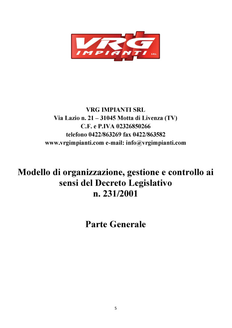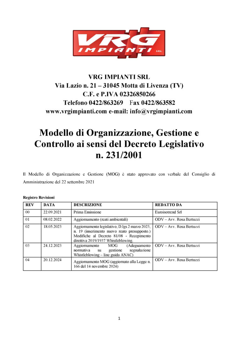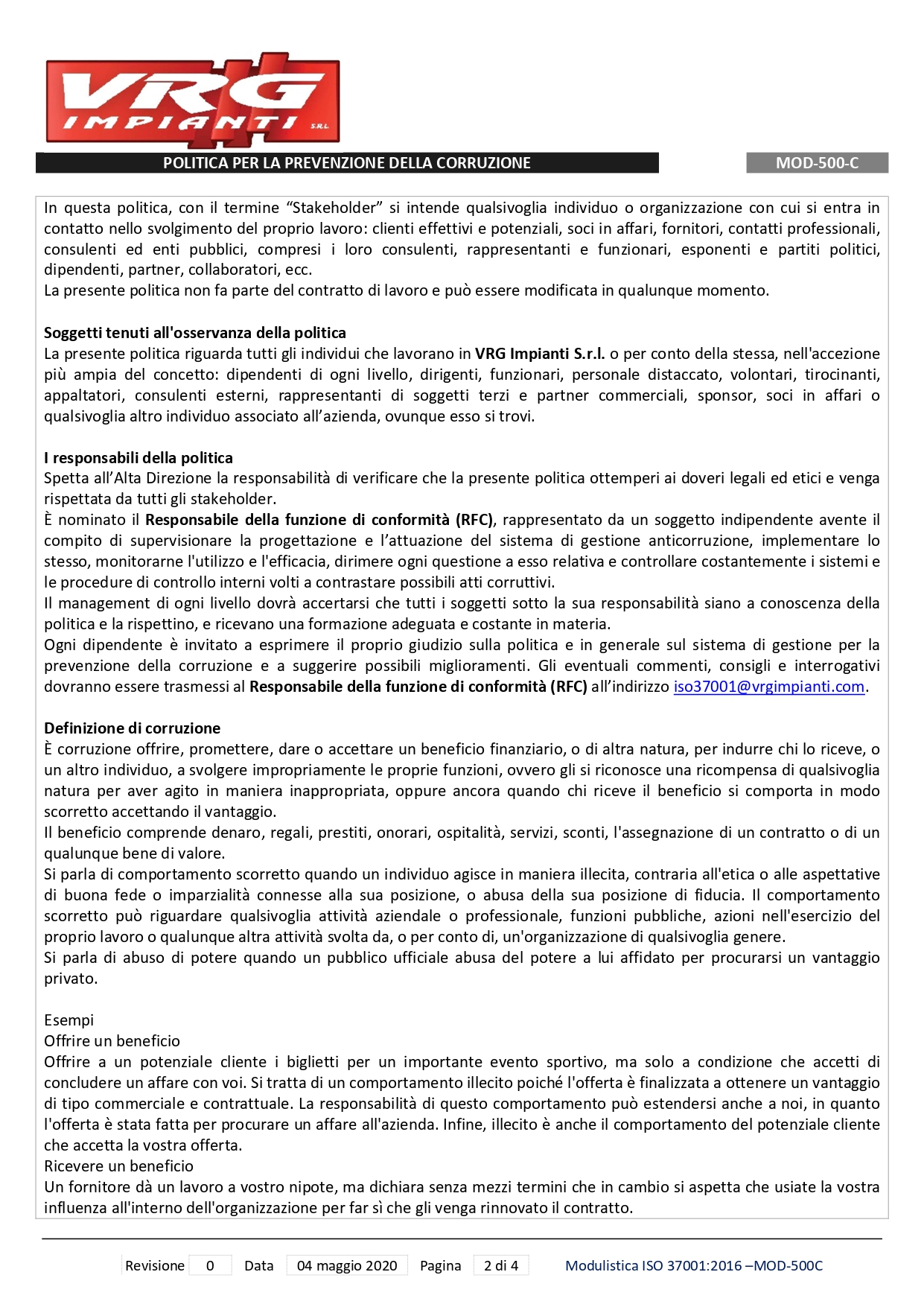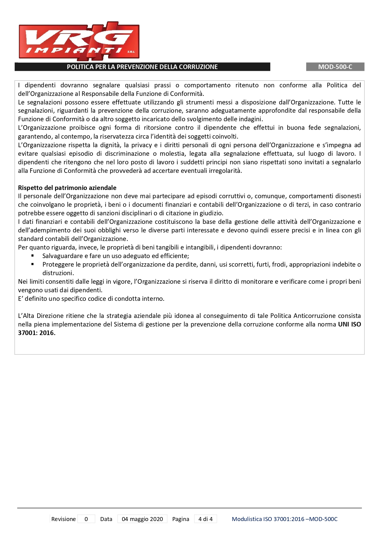 VRG Impianti Srl ha implementato un Sistema di Gestione per la prevenzione della corruzione secondo la norma UNI EN ISO 37001:2016, ottenendo nel 2020 la certificazione.