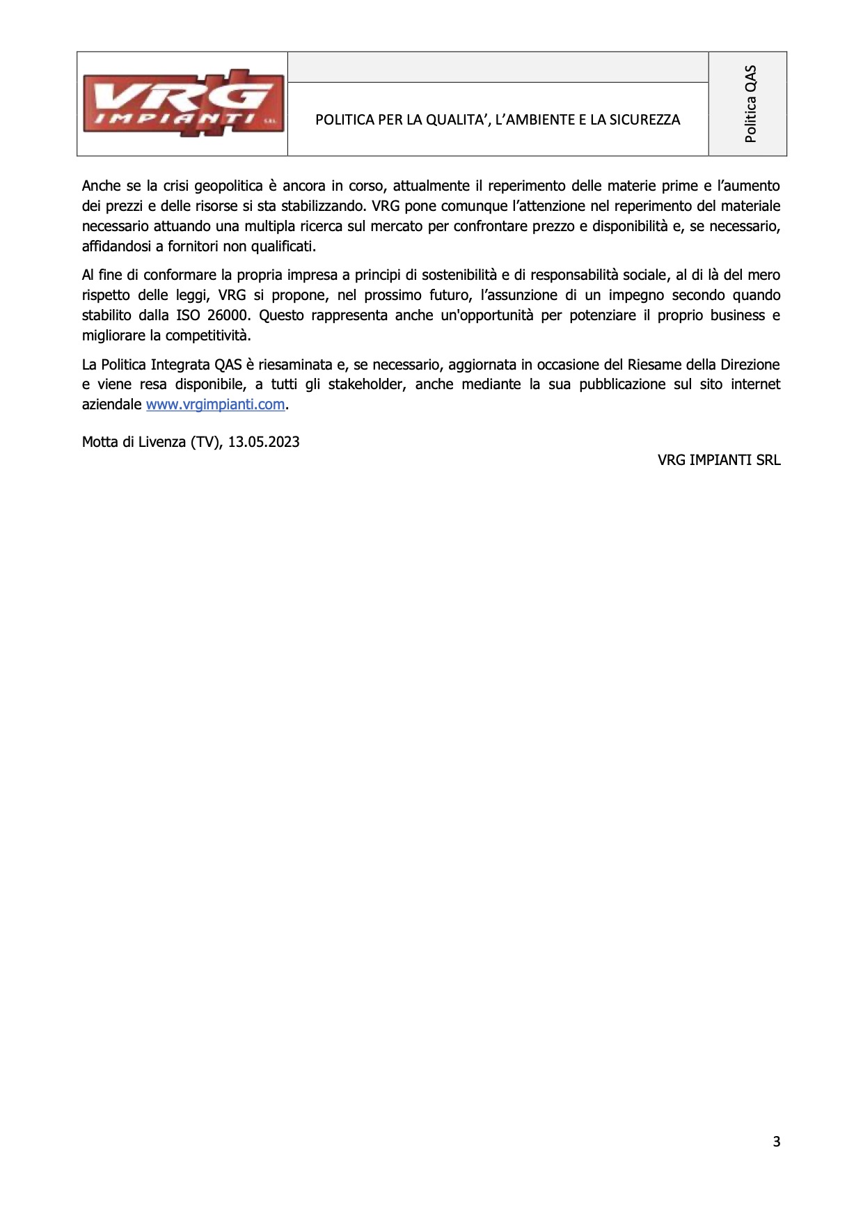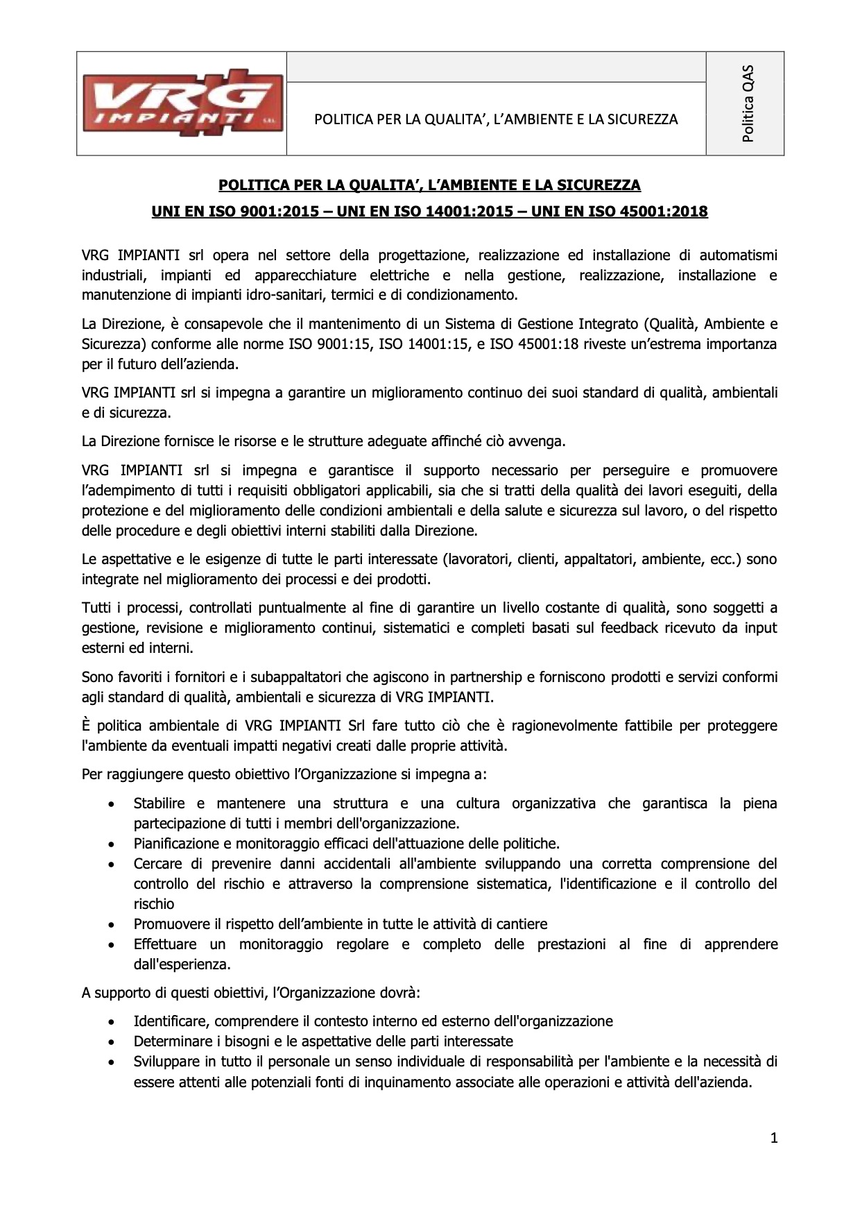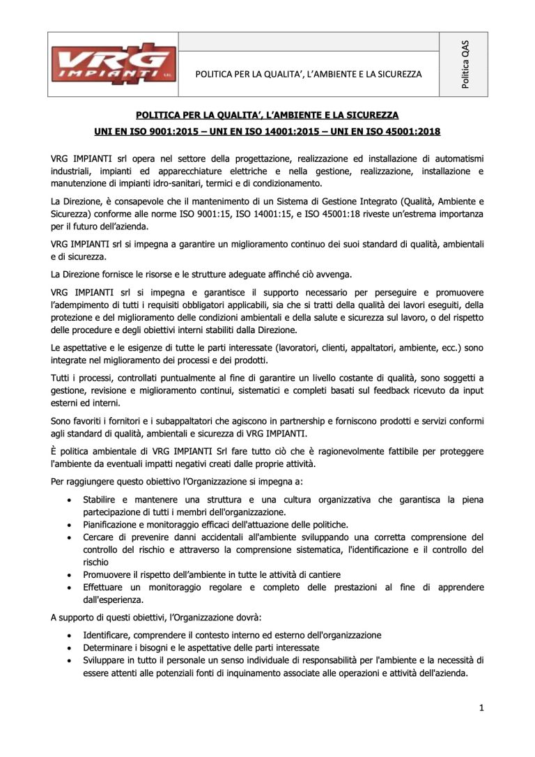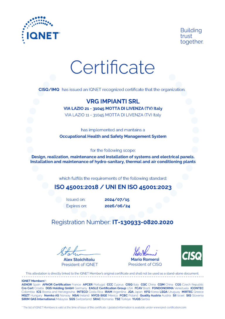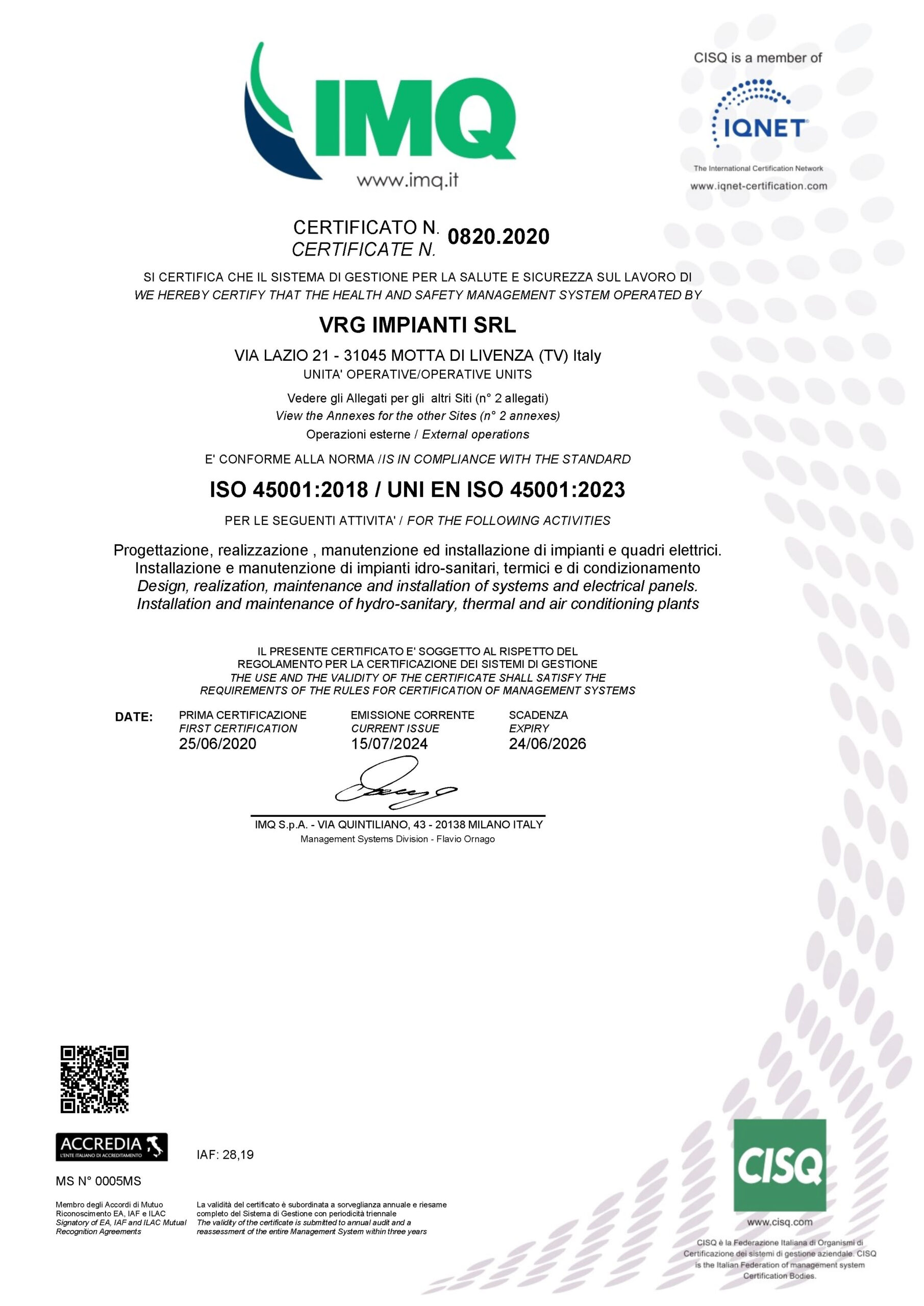 VRG Impianti Srl ha implementato un Sistema di Gestione per la Salute e la Sicurezza sul Lavoro secondo la norma UNI EN ISO 45001:2018 , ottenendo nel 2020 la certificazione