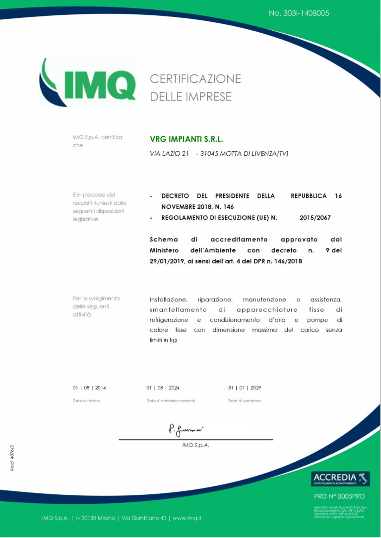 Installazione, manutenzione o riparazione di apparecchiature fisse di refrigerazione, condizionamento d’aria e pompe di calore contenenti taluni gas fluoranti ad effetto serra ai sensi del Regolamento (CE) 303/2008