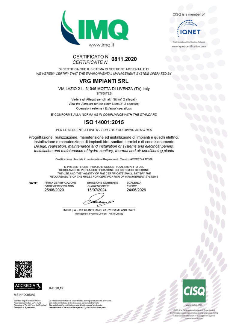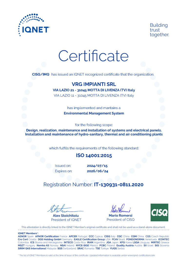 VRG Impianti Srl ha implementato un Sistema di Gestione Ambientale secondo la norma UNI EN ISO 14001:2015, ottenendo nel 2020 la certificazione.