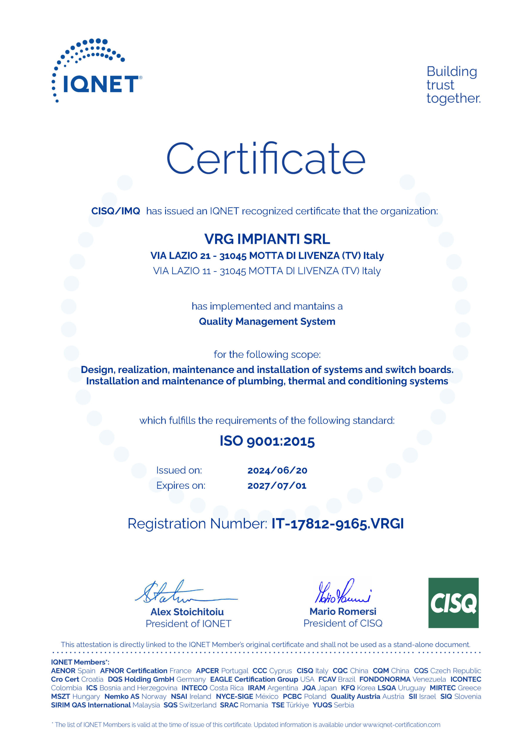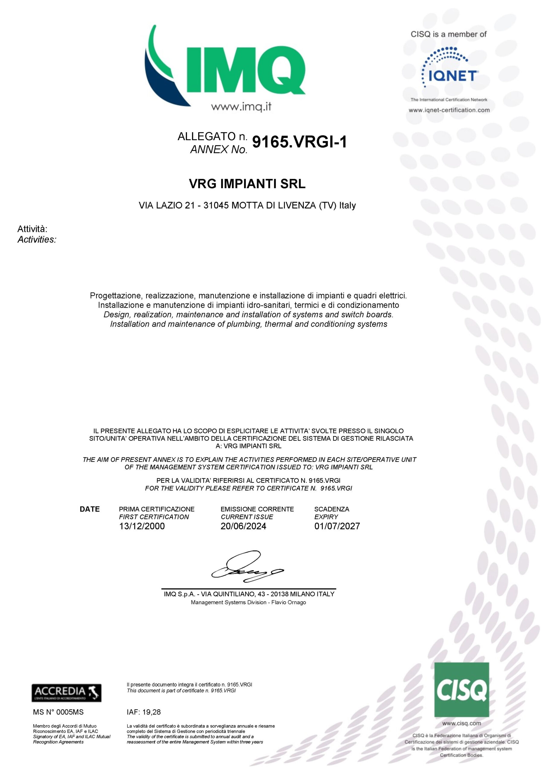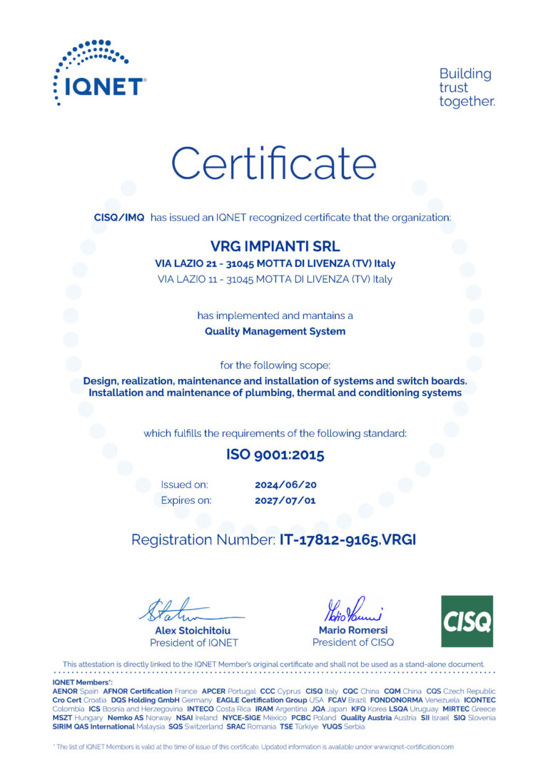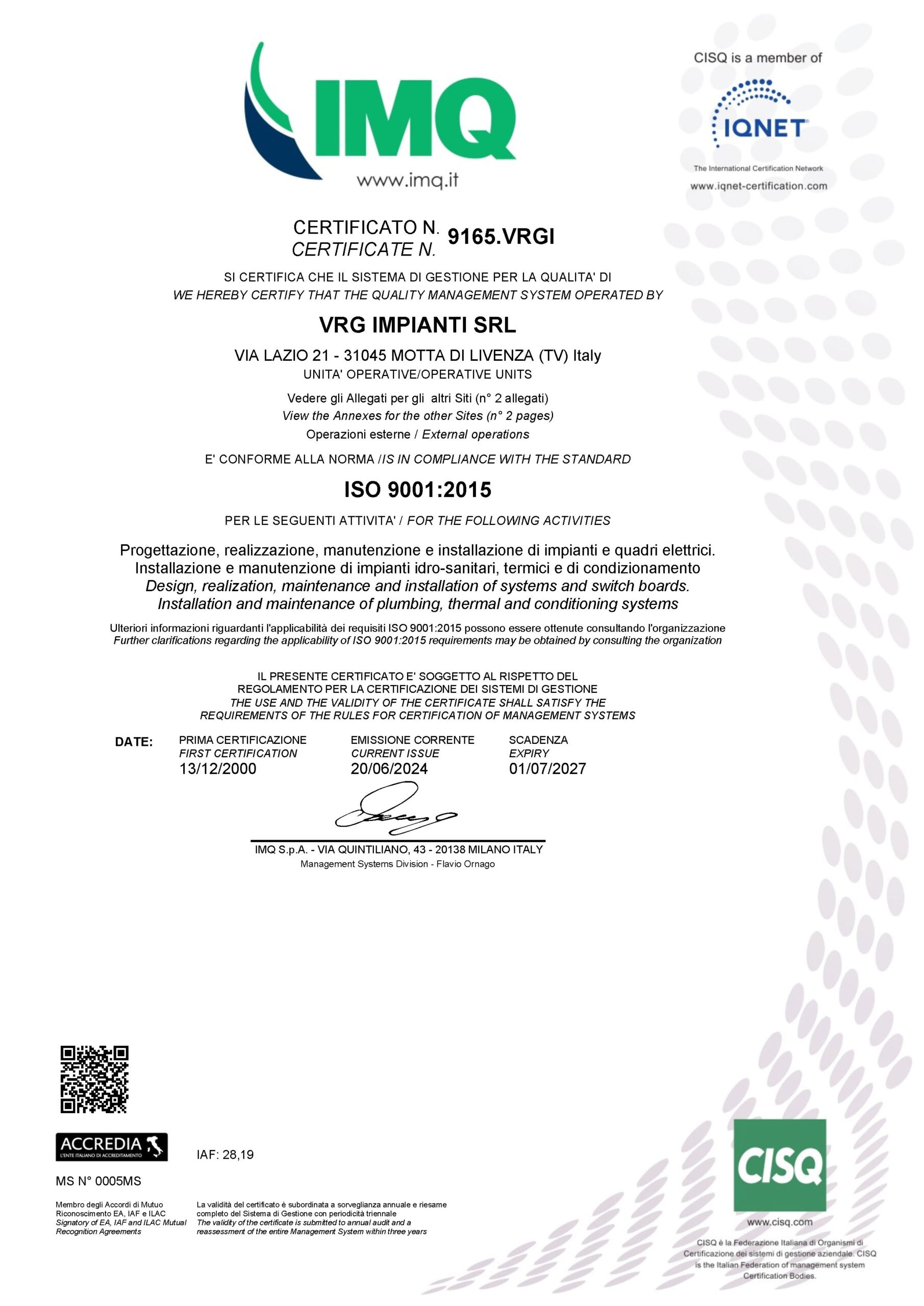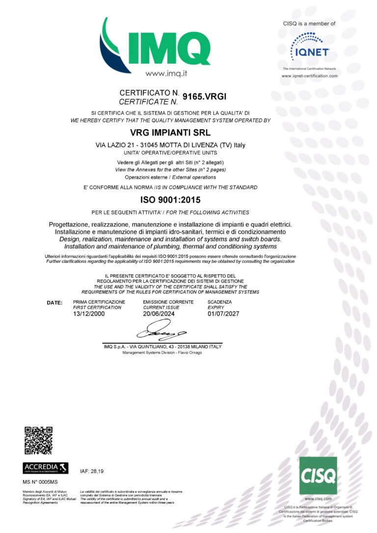 Dal 2000, VRG IMPIANTI ha certificato il suo Sistema di Qualità aziendale secondo la UNI EN ISO 9001:2015 mantenendolo costantemente negli anni.