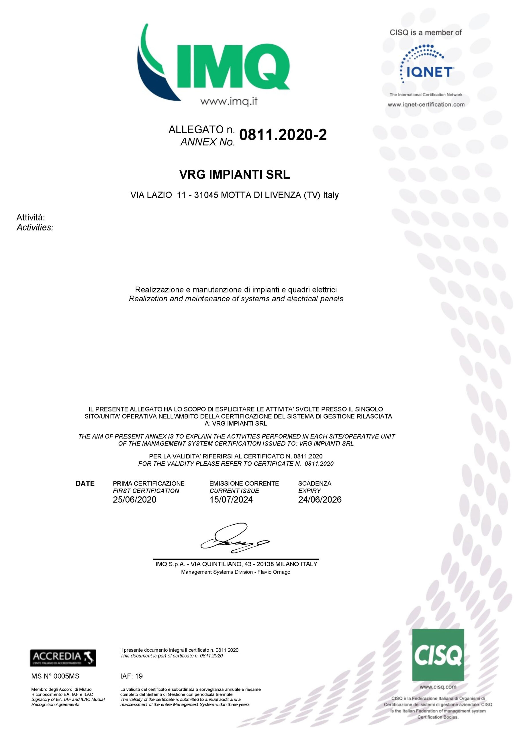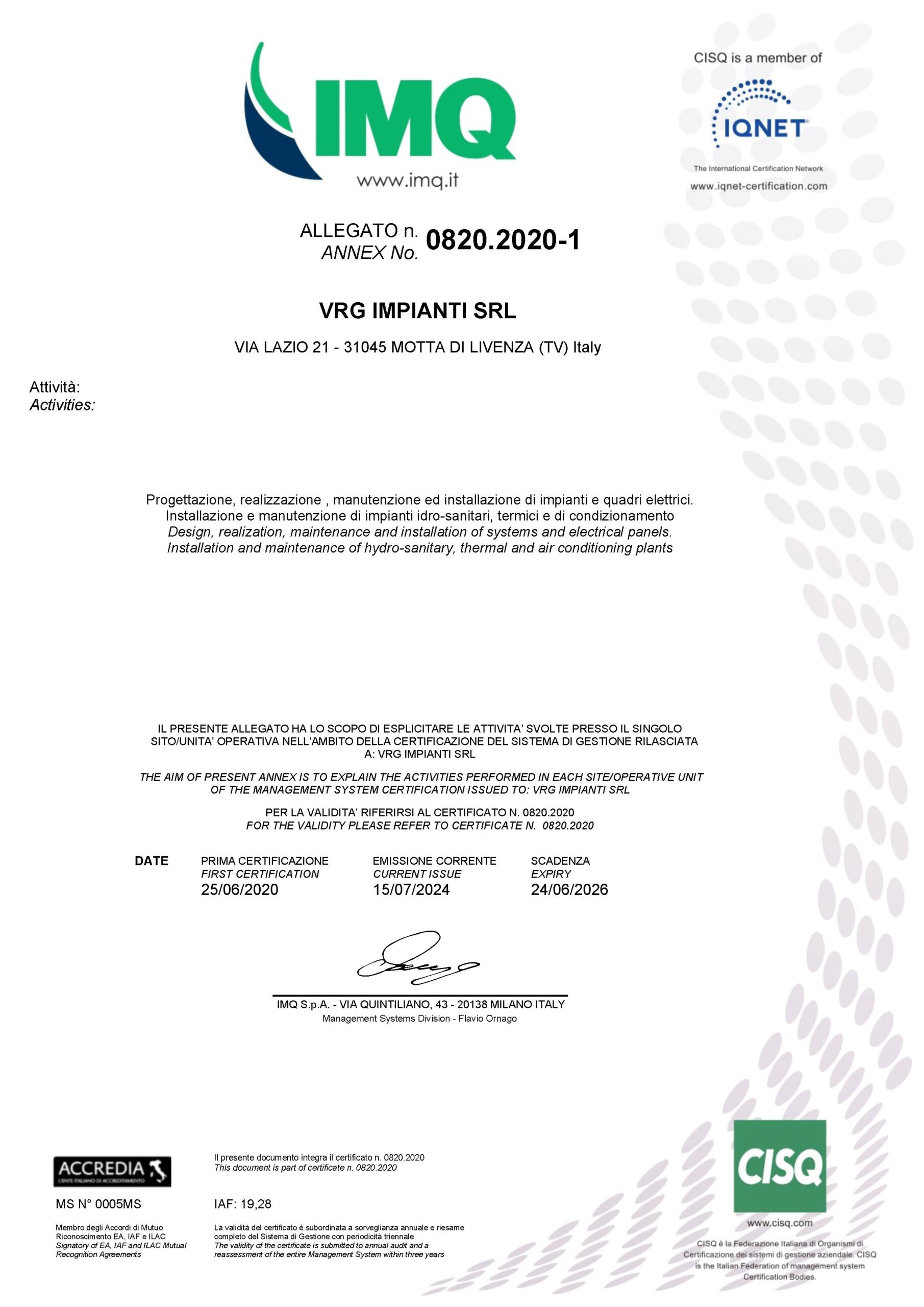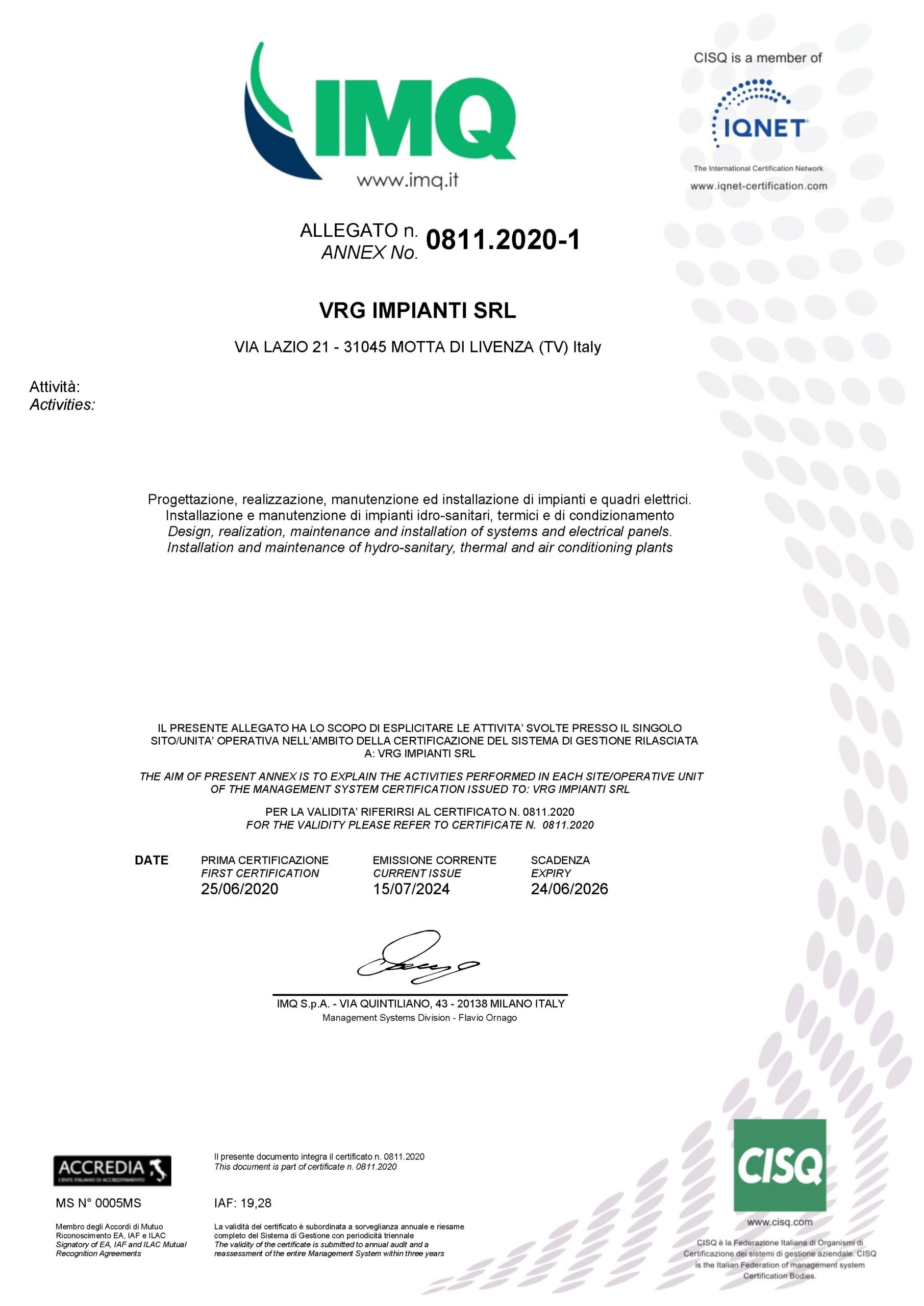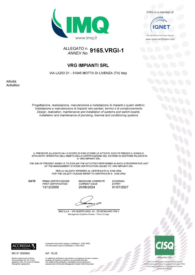 Dal 2000, VRG IMPIANTI ha certificato il suo Sistema di Qualità aziendale secondo la UNI EN ISO 9001:2015 mantenendolo costantemente negli anni.